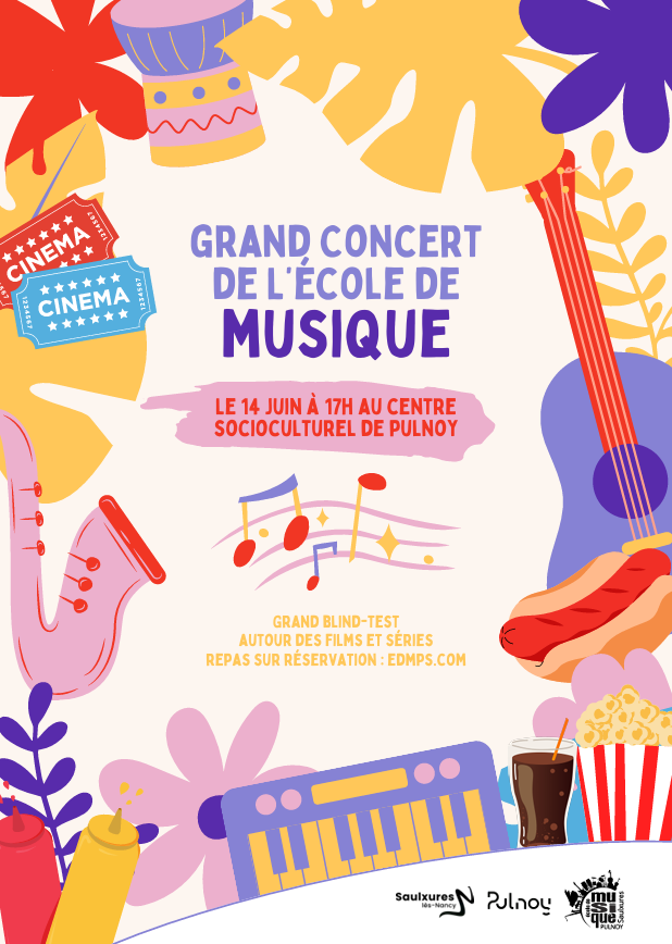 🎶 Venez fêter la fin d’année de l’école de musique le samedi 14 juin au centre socioculturel de Pulnoy ! Concerts, ambiance ciné-séries, repas façon salle obscure (hot-dog, pop-corn, boisson), tombola ludique et gros lot (2 places pour Walygator !) vous attendent. Un moment festif, en musique et en famille, pour célébrer ensemble nos jeunes (et moins jeunes) talents et soutenir l’école ! 🎬✨